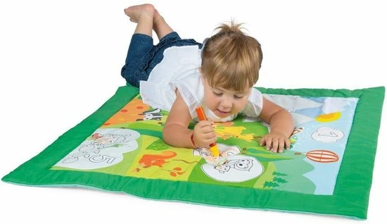 Wat maakt dit vloerkleed nou extra leuk? Hij heeft 5 vakken die je kleine zelf in kan kleuren met een stift op waterbasis (meegeleverd). Waneer je kindje op het aquadoodle vloerkleed tekent komen er mooie kleuren tevoorschijn. Zodra het water is opgedroogd verdwijnen de tekeningen en kan er weer opnieuw iets getekend worden. Ideaal dus voor de creatieve tekenaars!
