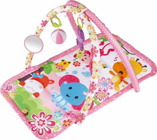 De boog met 4 speeltjes zal ervoor zorgen dat je kleine heerlijk kan spelen. Beiden zijn afneembaar, zodat de speeltjes ook kunnen worden gekoppeld aan de buggy. Het nijlpaard maakt muziek en werkt met knoopcelbatterij (inbegrepen). Naast het spelen, kan je kindje er ook op liggen en ontspannen. Het gewatteerde speelkleed heeft een lengte van 78 en is 52 cm breed en is gemaakt van textiel en kunststof. Verder is het kleed waterafstotend en het is geschikt vanaf de geboorte.