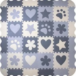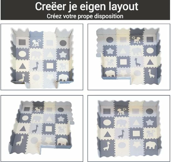 Met 36 verschillende tegels in negen verschillende kleuren zijn de opties eindeloos. Kinderen kunnen hun fantasie volledig de vrije loop laten en alsmaar nieuwe patronen creëren. Tevens zorgen de bijgeleverde eindgrenzen (zes voor iedere kleur) voor een mooie afwerking aan de randen, zodat teentjes nergens aan blijven haken. Zet de randen omhoog om speeltjes en ballen binnen de mat te houden.