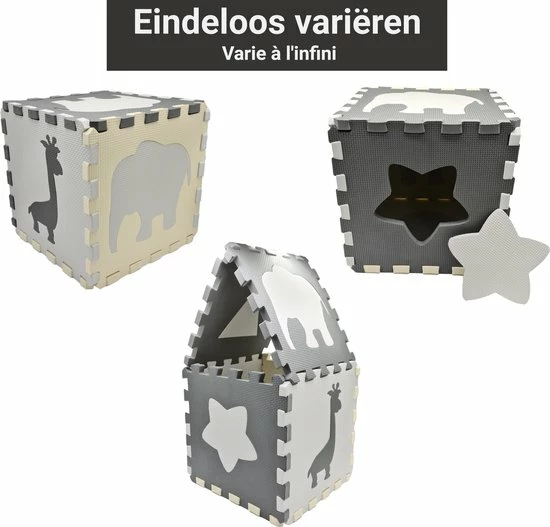 Het gehele puzzelmat kan omgetoverd worden in zes verschillende dozen. Ieder puzzelstuk is met precisie uitgesneden zodat de mat gemakkelijk op verschillende manieren in elkaar gelegd kan worden en je er dus zelfs leuke speelkubussen van kunt maken. Tevens kunnen deze boxen dienen als eventuele opslag.