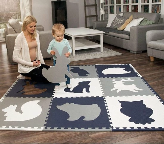 De mat is iets groter dan de meeste reguliere matten, dit komt omdat de mat bestaat uit 9 vierkanten van elk 60 x 60 cm. 12 randen maken de mat compleet. De mat is gemaakt van hoogwaardig EVA-schuim en is 1,2 cm dik. Dankzij de veilige in elkaar grijpende grote diervormen passen de stukken nauw op elkaar waardoor ze veel comfort en demping bieden op zachte en harde ondervloeren.
