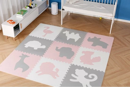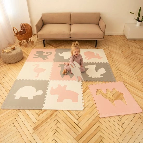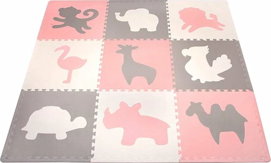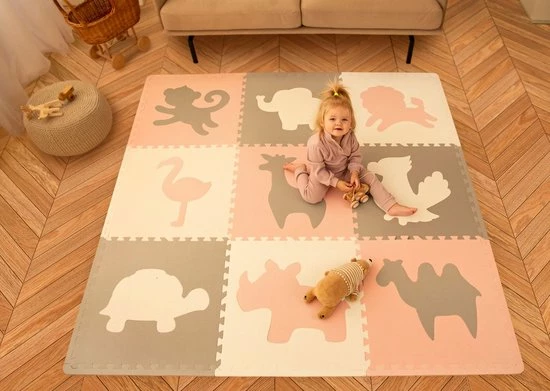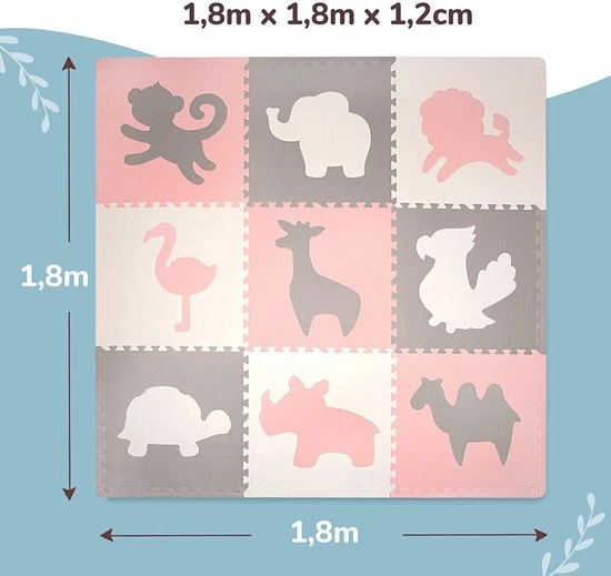 De mat is iets groter dan de meeste reguliere matten, dit komt omdat de mat bestaat uit 9 vierkanten van elk 60 x 60 cm. 12 randen maken de mat compleet. De mat is gemaakt van hoogwaardig EVA-schuim en is 1,2 cm dik. Dankzij de veilige in elkaar grijpende grote diervormen passen de stukken nauw op elkaar waardoor ze veel comfort en demping bieden op zachte en harde ondervloeren.