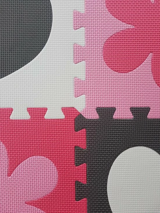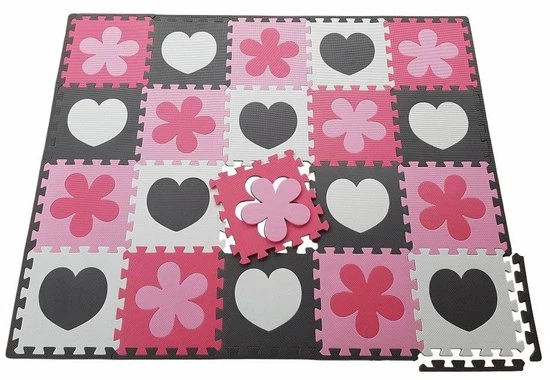Maak een leuke en veilige speelmat met deze foam puzzel speelmatten. De puzzel speelmatten zijn eenvoudig aan elkaar te koppelen om zo een groter speeloppervlak te creëren. De speelmatten zijn makkelijk op te bergen in de bijgeleverde opbergtas, goed afneembaar en bieden binnenshuis extra comfort en veiligheid voor uw kind. De hartjes en bloemen zijn uitneembaar en u kunt de matten in vele combinatiemogelijkheden leggen. Ideale puzzelspeelmat voor op uw harde, gladde, koude vloer die er ook nog eens superleuk uit ziet! 20 Foam puzzel speelmatten bestaande uit grijs/wit uitneembaar hart en roze/lichtroze uitneembare bloem incl. nette grijze afwerkrand en handige opbergtas Totale afmeting mat 152x122x1cm
