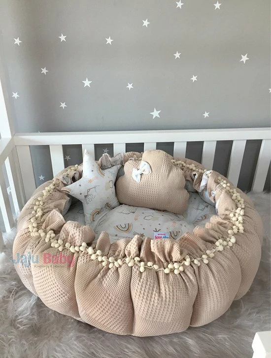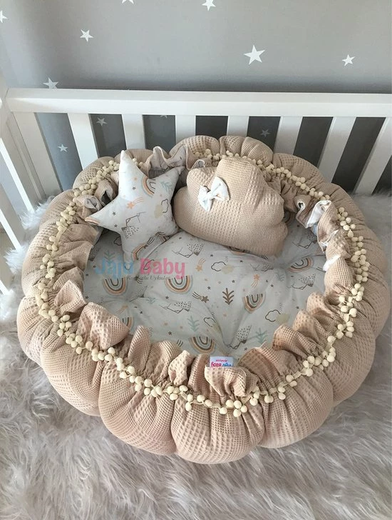 Jaju Baby baby nest is specially designed for the development of the spine of babies. Produced from 100% organic cotton luxury fabric. Jaju Babynest is antibacterial and antiallergic. It has a zippered inner lining and is machine washable. Suitable for babies up to 2 years. Sponge and pearl fibres are used that absorb moisture and steam. It does not make the baby sweat.