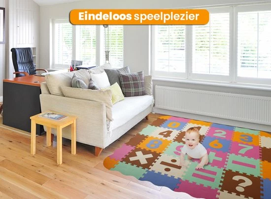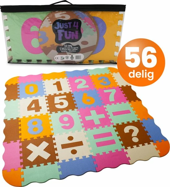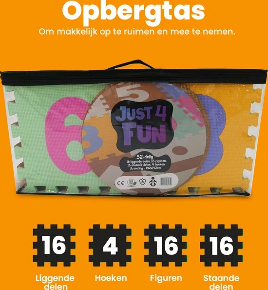 De Just4Fun® pleziermat is zo veelzijdig, omdat je nu met deze mat niet alleen jouw vloer beschermt, maar ook met kruipende of rollende kindjes goed kan gebruiken als zachte onderlaag. De tegels zijn maar liefst 15mm dik. Met een veilig anti-slip oppervlak en omdat ons EVA-schuim waterafstotend is, maak je in een handomdraai de mat schoon. Grenzeloos creëren kan. Jouw kind is creatief, maar je wilt ook natuurlijk de boel opruimen, voor het geval dat er gasten komen of dat je over het speelgoed en de speelmat heen loopt. Geen zorgen, want je kunt deze speelmat heel gemakkelijk weer in de opbergtas stoppen. Opgeruimd staat netjes. Dagje uit spelen? Neem hem dan ook makkelijk mee!