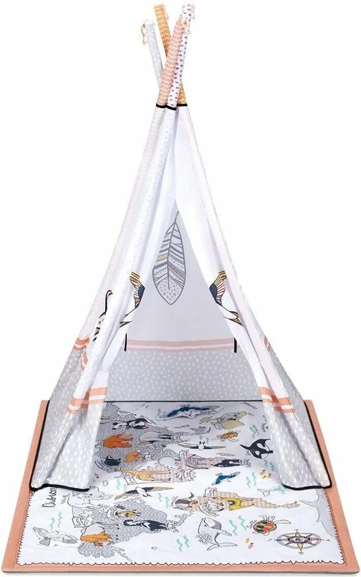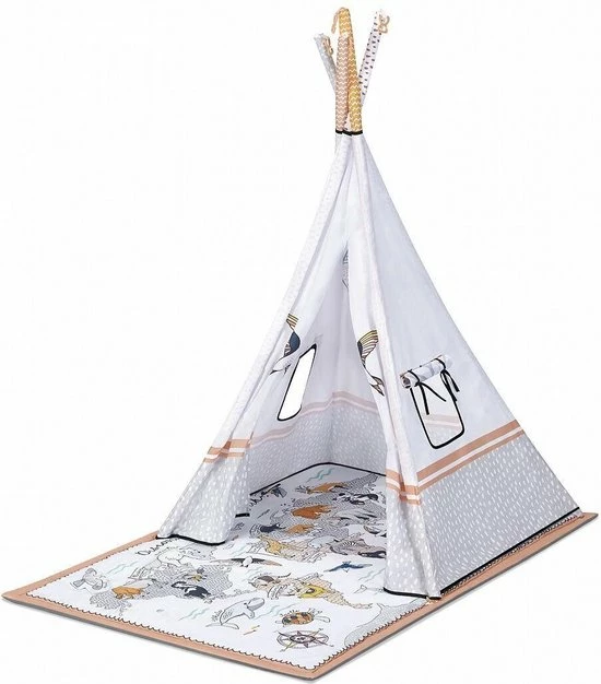 De tipi tent heeft 2 ramen met stoffen gordijnen zodat de ouder vrij naar binnen kan kijken en kan zien wat de kleine doet. De speelbogen zijn gemaakt van een zachte spons, zodat zelfs bij de wildste verkenners het kind veilig is. TIPPY is een uniek speelkleed – het zal elk kind veel plezier geven. De set bevat ook speelgoed voor de allerkleinsten: een pluche speelgoedje met een knaagdier, een pluche zwaluw met linten en een rammelaar met een pluche boomblad, een spiegel, twee ritselende speeltjes op het speelkleed.