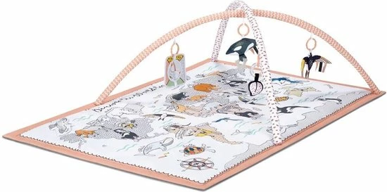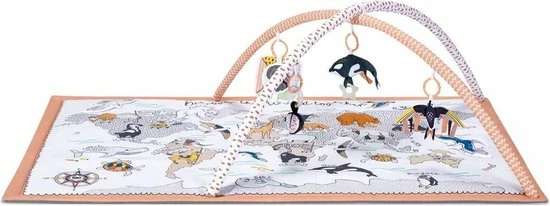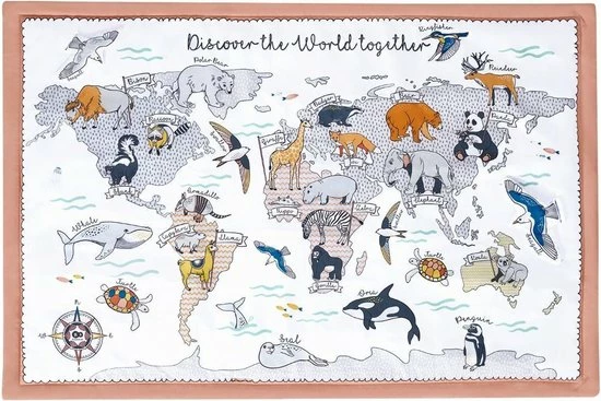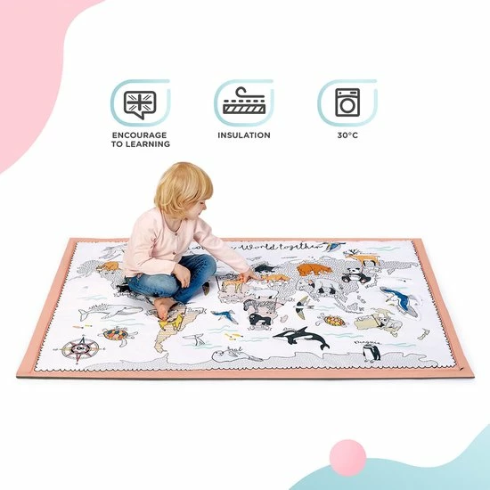 - en bovendien vermaakt en leert het: de continenten en de dieren die er wonen worden zijn op het speelkleed gedrukt en in het Engels beschreven.