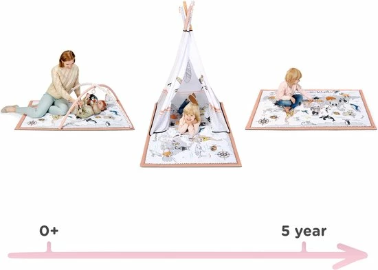 Het TIPPY 3-in-1 educatief speelkleed is een uniek speelkleed met een prachtig design, dat op 3 manieren gebruikt kan worden: als een speelkleed met een speelboog voor de jongste kinderen (vanaf de geboorte tot 1 jaar), als een speelkleed met een tent (tipi) voor oudere kinderen (tot 5 jaar) en als een onafhankelijk speelkleed voor gebruik in de open lucht tijdens warme dagen.