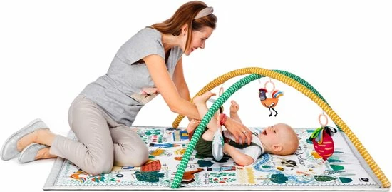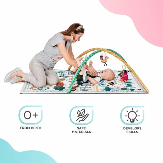 - Het speelkleed is zeer gemakkelijk schoon te maken. Je kunt de basis gemakkelijk met de hand wassen en de rest (speelgoed en speelbogen) gewoon afnemen met een vochtige spons.
