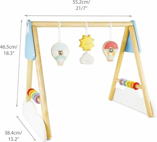 Een heerlijke stevige babygym, gemaakt van natuurlijk rubberhout met gladde afgeronde randen. Versierd met het thema wolk en berg, met kleurrijke, opwindende heteluchtballonnen die rammelen. Afgewerkt in zachte pastel en felle kleuren.