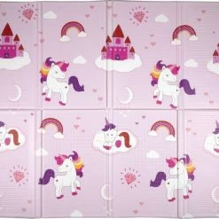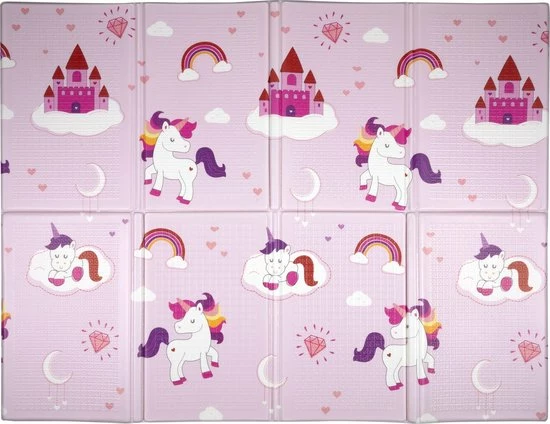 Houd naast luiers, flesjes, extra kleertjes, speentjes en andere baby-essentials, ook een plaatsje vrij in de luiertas voor dit speelkleed van Let’s Play. Of leg deze praktische kunststof babymat standaard in de auto of stop hem in je fietstas. Deze mooie speelmat is roze en is gedecoreerd met schattige eenhoorns, regenbogen en luchtkastelen. Je vouwt hem op tot een klein pakket zodat je hem gemakkelijk meeneemt.