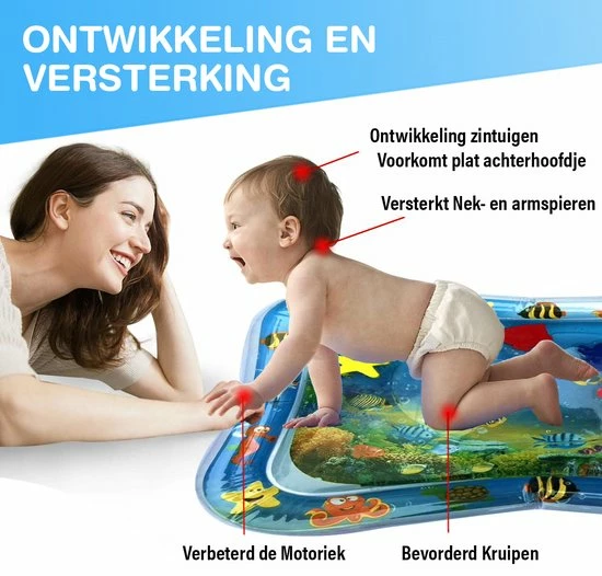 De waterspeelmat stimuleert de motorische ontwikkeling van een baby. Het werkt als een babygym en traint de hoofd- en nekspieren, maar ook de arm- en schouderspieren. Dit komt doordat baby’s willen uitreiken naar objecten in de watermat zodra zij op hun buik liggen. Verder wordt hierdoor de oog-handcoördinatie beter ontwikkeld. De waterspeelmat is een perfecte combinatie van speelplezier, leren en beweging voor je kind!