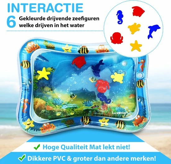 De waterspeelmat van Luxema zorgt voor urenlang speelplezier! Doordat de binnenzijde van de speelmat is gevuld met water zullen de figuurtjes na aanraking verplaatsten door het water. Hiermee geef je een leuke interactie aan het kind die met volle aandacht en interesse met de leuke figuurtjes kan spelen en die de leuke kleuren en zeedieren kan ontdekken die zich in de waterspeelmat bevinden.