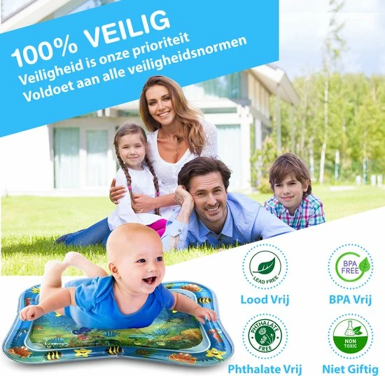 Veiligheid in onze prioriteit. De Waterspeelmat voldoet aan alle veiligheidsnormen en is vrij van BPA, Lood en Phthalate. Tevens is hij gemaakt van extra stevig PVC waardoor hij niet gaat lekken.