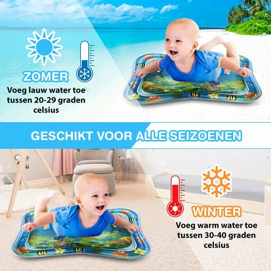 De Waterspeelmat is geschikt voor elk seizoen het hele jaar door! In de zomer vul je de watermat met kouder water (20 tot 29 graden) voor een heerlijke verkoeling en in de winter met lauw water (30-40 graden) zodat je kindje aangenaam lekker kan spelen!