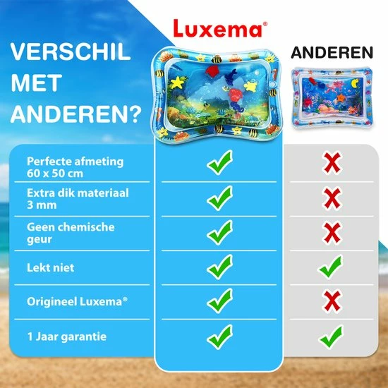 De Luxema watermat is het ideale speelgoed voor baby’s van 3 maanden of ouder. De waterspeelmat is veilig en waterdicht door gebruik van extra dik materiaal. De baby speelmat is niet alleen leuk, maar verbetert ook de algemene motorische ontwikkeling van een kind. Het spelen met de watermat dient als stimulans voor het jonge brein en versterkt de nek- en armspieren. Laat na speeltijd het water en lucht eruit lopen en berg het speelgoed makkelijk op. De baby speelmat is het gehele jaar te gebruiken en perfect als kraamcadeau.