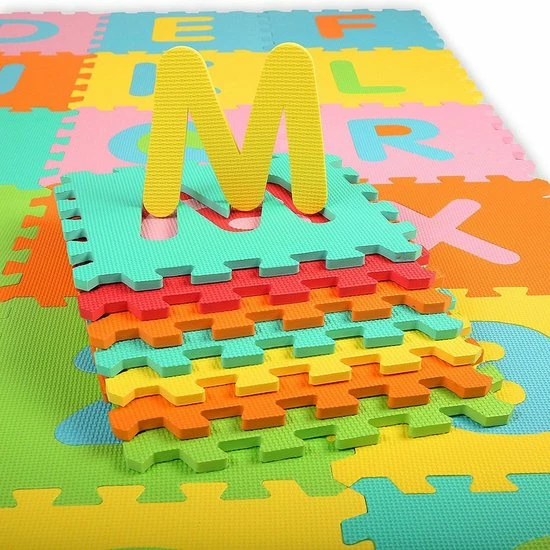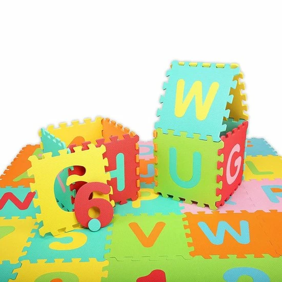 86 delige puzzelmat De puzzelstukken bevatten de 26 letters van het alfabet en de cijfers 0-9.