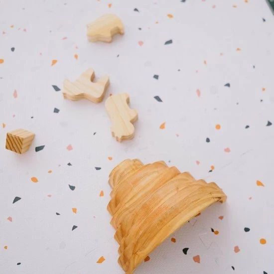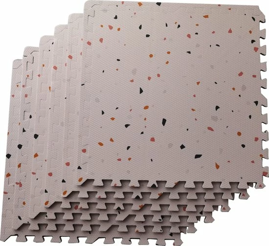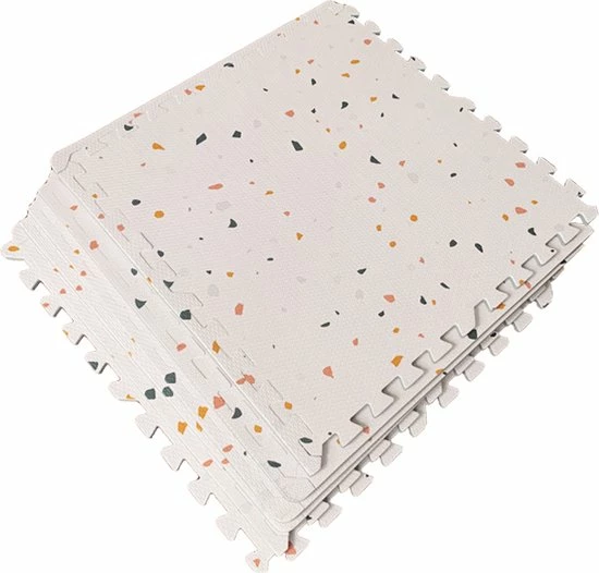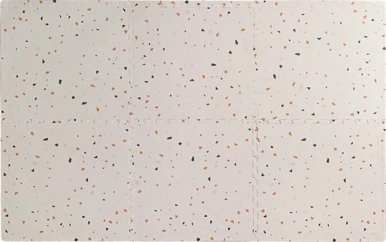 De speelmat bestaat uit 6 zachte vloertegels die gemakkelijk als een puzzel in elkaar te klikken zijn. Hierdoor is de speelmat gemakkelijk neer te leggen maar ook weer op te bergen. De speelmat heeft een naadloos design met een terazzo print, hierdoor staat de mat ook nog eens stijlvol in uw kamer.