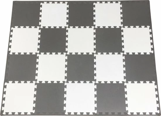 Ideale puzzelspeelmat voor op uw harde, gladde, koude vloer die er ook nog eens superleuk uit ziet! 20 grijs witte matten incl afwerkranden en opbergtas. Totale afmeting mat 152x122cm