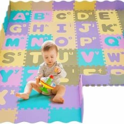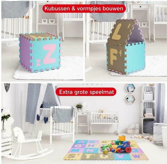De baby mat is voorzien van alle letters van het alfabet om het alfabet te leren. Deze educatieve foam mat is heel groot zodat baby’s en/of kinderen met gemak op de vloer kunnen spelen. Kleine kinderen kunnen hiermee ook kubussen bouwen en allerlei vormpjes. Daarnaast kunnen ze ook woordcombinaties maken.