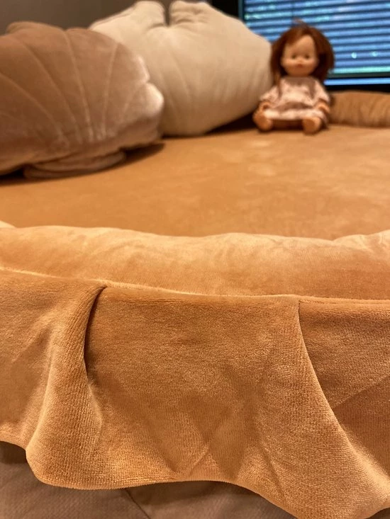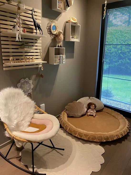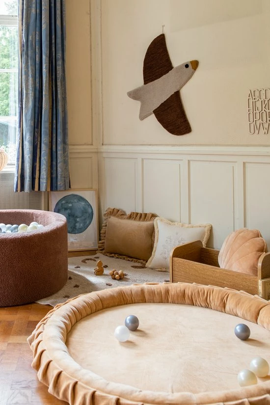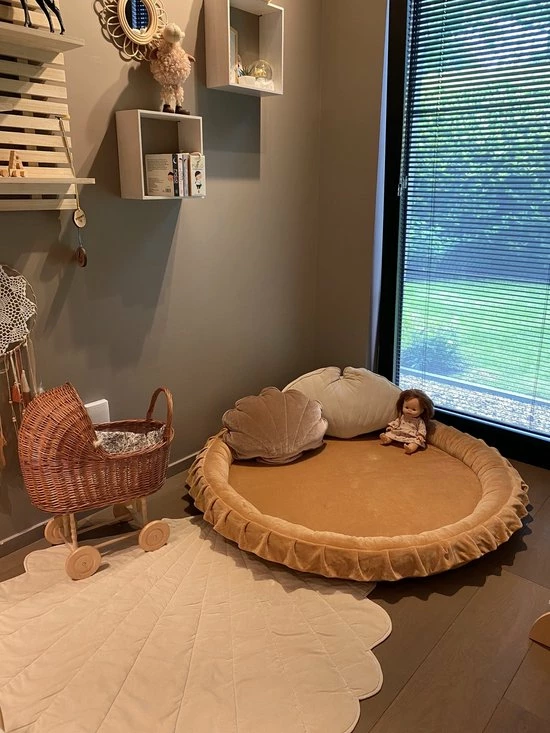Ontdek ons populair speelnest van het merk MOJE dat gemaakt is van ultiem zachte velours. Deze warme en trendy kleur past mooi in de meest trendy interieurs en de ruches aan de rand van dit speelnest maken de look volledig af.