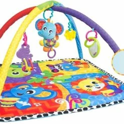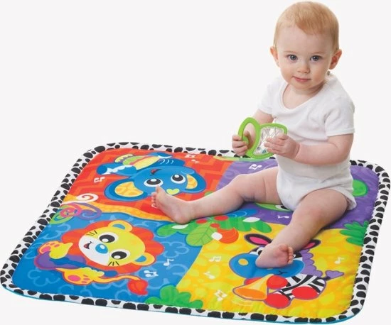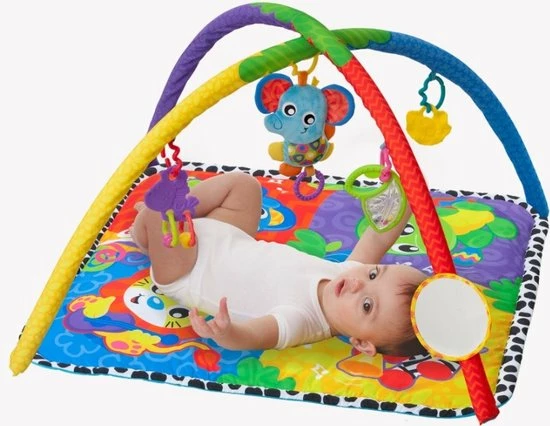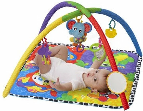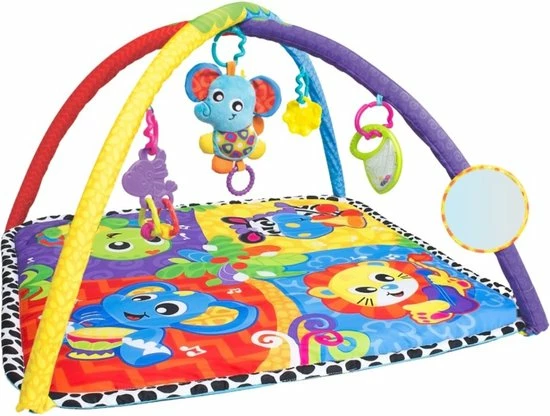 Playgro – Speelkleed – Muziek in de jungle activiteiten gymDe Playgro activiteitengym is een muzikaal babyspeelkleed met vijf afneembare, hangende speeltjes, waarvan een met vier verschillende liedjes. Zo kan je kleintje lekker dansen! De gym zorgt ervoor dat je baby in beweging komt en het gehoor gestimuleerd wordt. Je kleintje kan op verschillende manieren met de gym spelen. Hij of zij kan er op de buik, zitten of liggend op de rug mee spelen. Al met al een gym met heelveel mogelijkheden en 1 die meegroeit met je kleintje. De bogen van de gym zijn gemakkelijk los te koppelen om zo een zachte en veilige plaats te creëren voor oudere baby’s. Je kan de bogen er ook op laten zodat de baby kan oefen met het grijpen naar hangende speeltjes. Het pluche, muzikale olifanthangspeeltje speelt muziek af die speciaal voor Playgro is gecomponeerd en heeft ook een bijtring voor het kalmeren van pijnlijk tandvlees. Het paardhangspeeltje is een bijtring met klik-klakgeluiden en is ideaal voor doorkomende babytandjes. De spiegel helpt je kleintje bij het leren van reflecties. Daarnaast heeft het hangende blaadje ratelende balletjes aan de binnenkant die het gehoor stimuleren.