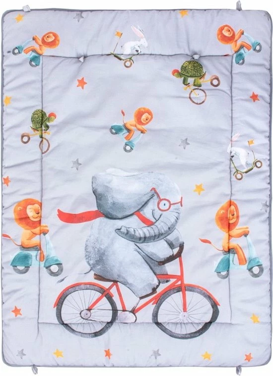 Het speelkleed is grijs van kleur met een lieve opdruk van verschillende diertjes.