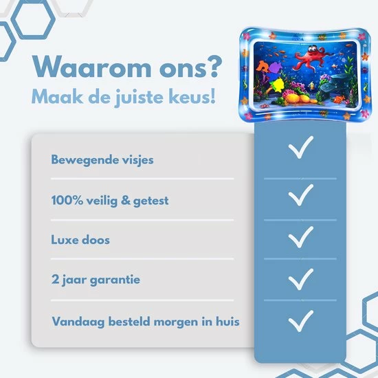 Doordat de watermat gevuld is met een laagje water, hierdoor moet je kleine steeds net een ander spiertje aanspannen om overeind te blijven. Dit gebeurd allemaal zonder dat die daarover na hoeft te denken maar op deze manier wordt de motoriek van je baby gestimuleerd.