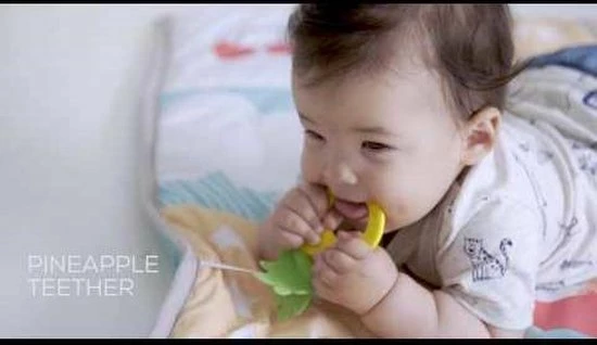 * baby veilige spiegel, verschillende plastic ringen, bijtring in de vorm van een ananas, verschillende stoffen die allen anders zijn en knisperende konijnen oren.