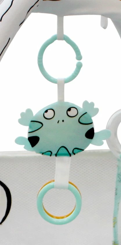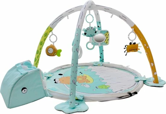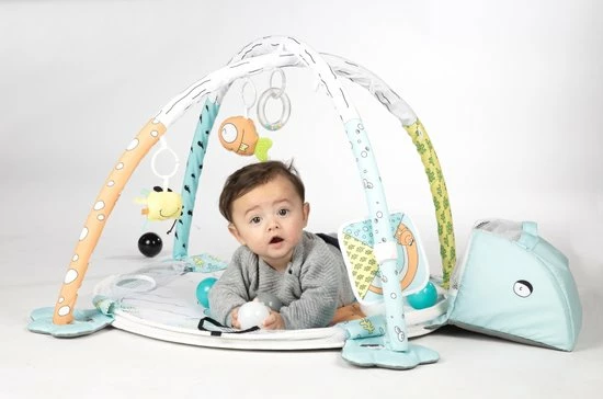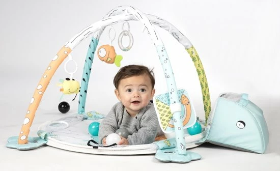 Fase 1. vanaf de geboorte kunt je kleine op het speelkleed liggen en spelen met de vijf speeltjes aan de bogen. De speeltjes bevatten o.a. een spiegeltje en rammelaar die de ontwikkeling van je baby stimuleren.