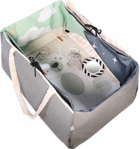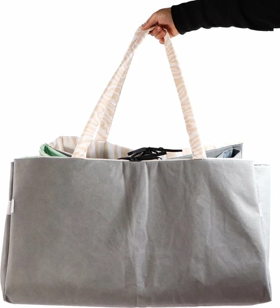 Is je kindje uitgespeeld? Maak binnen een handomdraai een opbergtas van het speelkleed! Vouw de zijkanten naar binnen en maak ze vast met de touwtjes. Al het speelgoed kan in de tas worden gestopt en gemakkelijk worden opgeborgen of meegenomen aan de hendels. Je kunt hem ook gebruiken als opbergmand. Super handig voor onderweg, een bezoekje bij opa en oma of lekker voor in huis.