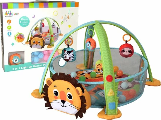 Een zachte mat gemaakt van aangenaam aanvoelend materiaal, met aantrekkelijke, levendige kleuren die de aandacht zullen trekken van de meest angstige baby. De leeuw kan gebruikt worden als ballenopslag. De babygym vormt de verbeelding van het kind, leert vormen en kleuren te onderscheiden en ontwikkelt de zintuigen van aanraking en zicht.