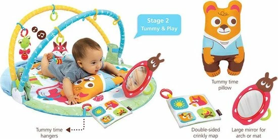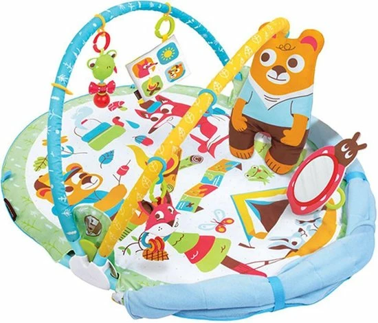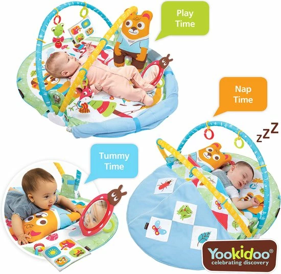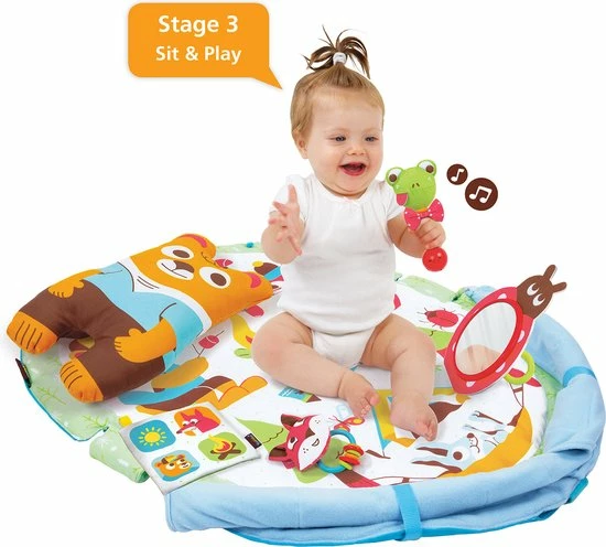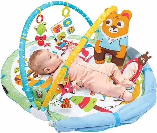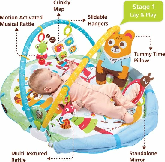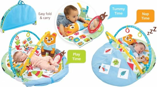 Speelkleed voor baby’s met 3 verschillende functies.1 als de baby isn slaap valt kun je deze toedekken met de flap deken. 2 Tummy Time met de bijgeleverde beer om op het buikje te spelen. Goed voor nek en rugspieren. 3 Op de rug rug spelen en de wereld ontdekken met de leuke speeltjes welke aan de boog hangen. Wordt geleverd met een Rammelaar, Muziekrammelaar Kikker, Spiegel,Kussen en Knisperboek. Gemakkelijk opvouwbaar en gemakkelijk mee te nemen. Machine wasbaar op 40 graden en liggend laten drogen.