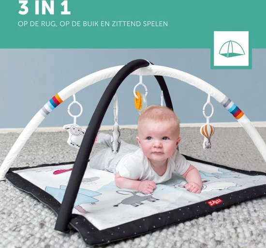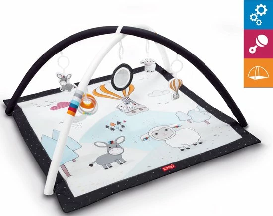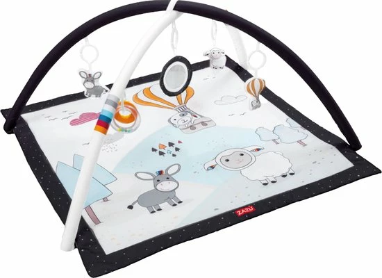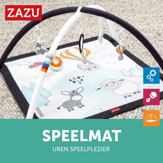 Laat je kleine verschillende dingen ontdekken op dit zachte Activity Gym Speelkleed van Zazu! Daarbij kan je kindje op de rug, op de buik en zittend spelen.Het kleed heeft twee speelbogen met 5 leuke speeltjes